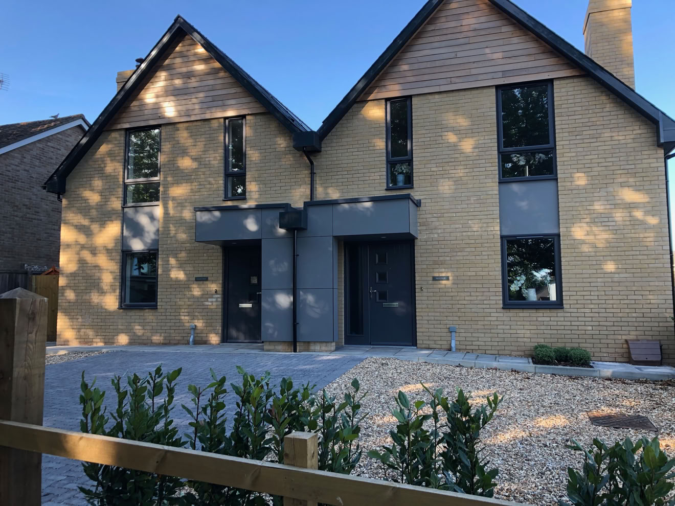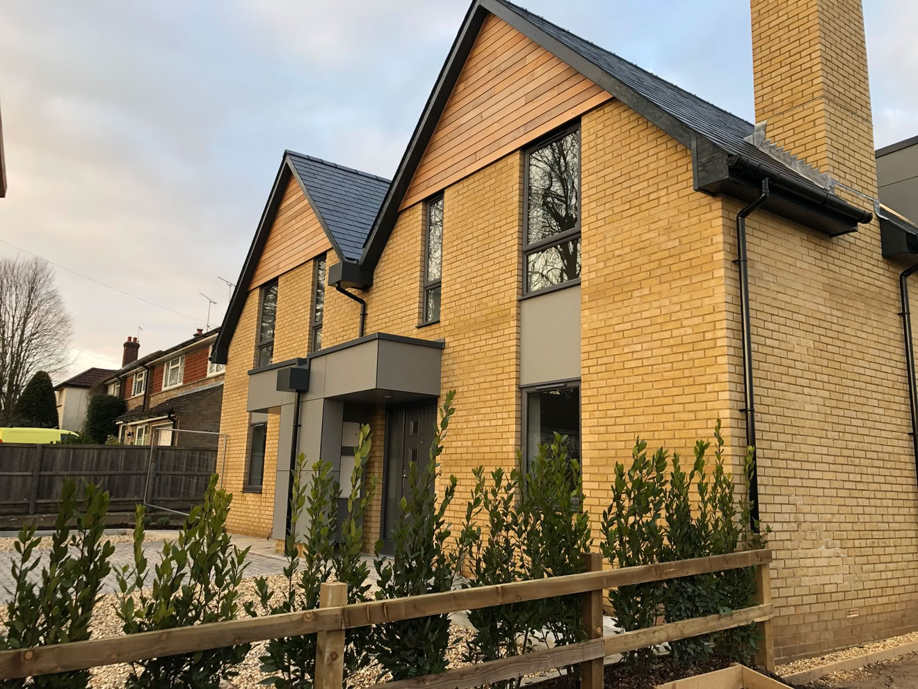 3 New homes in the centre of Alresford using clean pallete of materials and contemporary entrance details.